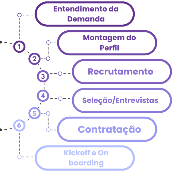 Nossa equipe de tech recruiters especializados conduz a seleção dos candidatos mais qualificados, avaliando criteriosamente hard skills e soft skills para garantir a melhor aderência ao seu projeto.